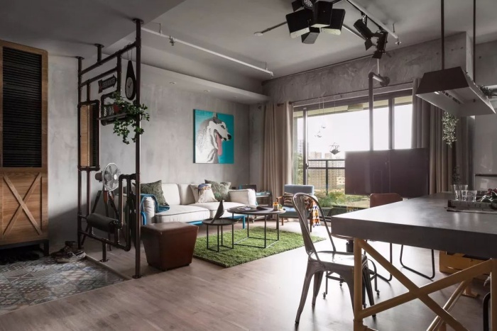 Khung cửa sổ rộng mở, ngập tràn ánh sáng giúp khoảng tường với màu của bê tông thêm điểm nhấn cuốn hút. Phần vách ngăn được sáng tạo bởi những ống nước kim loại, giúp các khu vực chức năng được tách biệt khéo léo, tăng thêm sự kết nối giữa các không gian một cách khéo léo và tinh tế.