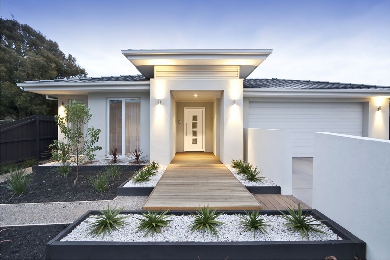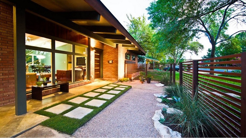 Tạo cho sân trước của bạn một cái nhìn mới mẻ và đậm nét hơn bằng một cây cầu gỗ tương phản với một con đường đá hoặc bê tông. Ngoài ra, bạn có thể trồng các loại cây tối giản để duy trì một sợi dây kết nối giữa khu vườn và sân trước.